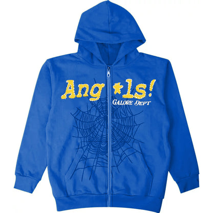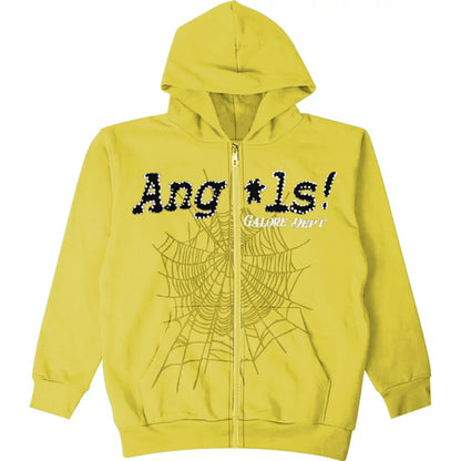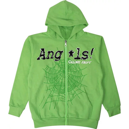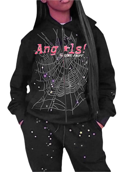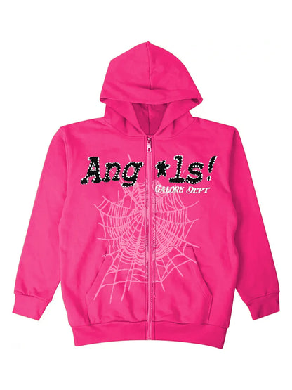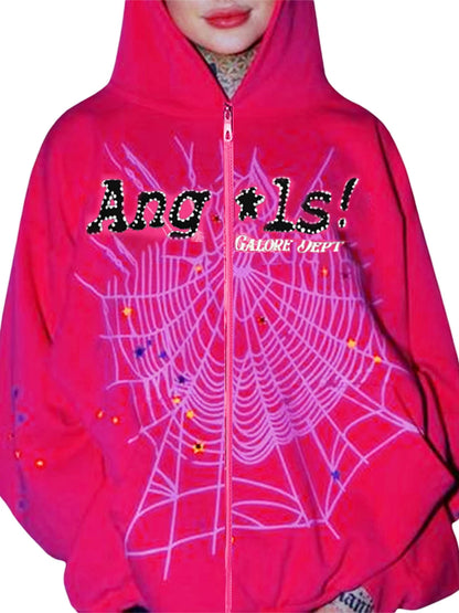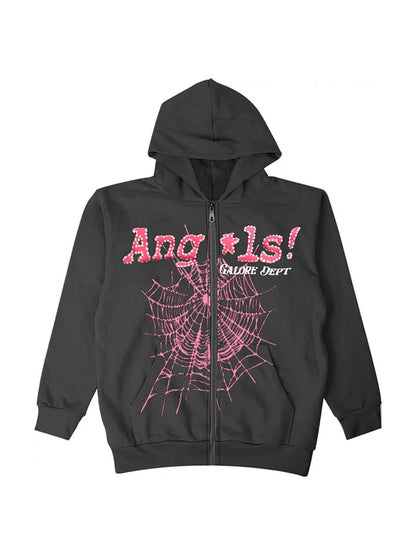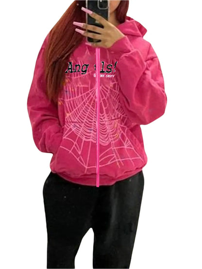 Angels Printed Spider Graphic Hooded weighs 500g, and features a pullover type, standard thickness, and a streetwear style. It has regular sleeves and a full sleeve length (cm). The piece is suitable for all seasons and winter release dates, with a Letter pattern type, made of a Polyester and Synthetic fiber material composition. It has no liner type and features a hooded design. Gender-wise, it is meant for women, with a Regular Fit Type, and a fabric content of 51-70% Broadcloth. Additionally, it has no elasticity and a straight clothing pattern with a Regular clothing length.