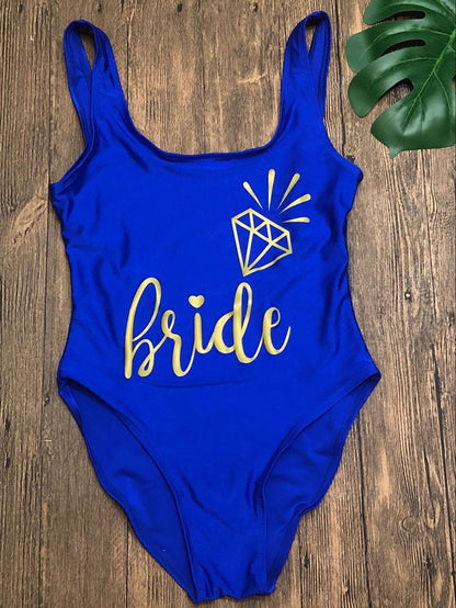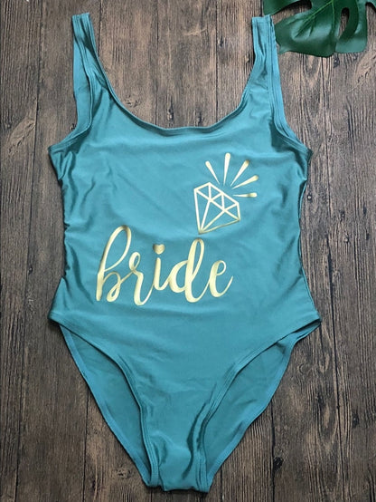 This Bride Gold Print Women One Piece Swimsuit is perfect for swimming in any season. The pattern type is lettering, the model number is Fashion Funny Bikini BRIDE, and the material is a combination of polyester and nylon. Its true-to-size fit makes it ideal for any woman.