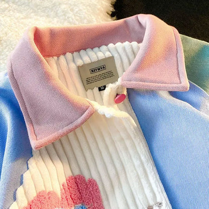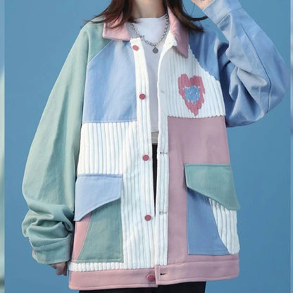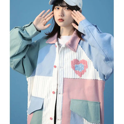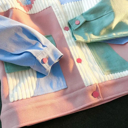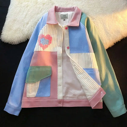 The Patchwork Corduroy Jackets boast decorative embroidery and spliced detailing, showcasing a standard thickness and a luxurious polyester material. This casual style features full-length sleeves and a classic turn-down collar with a single-breasted closure. Perfect as outerwear, this regular-length jacket adds sophistication and exclusivity to any outfit.