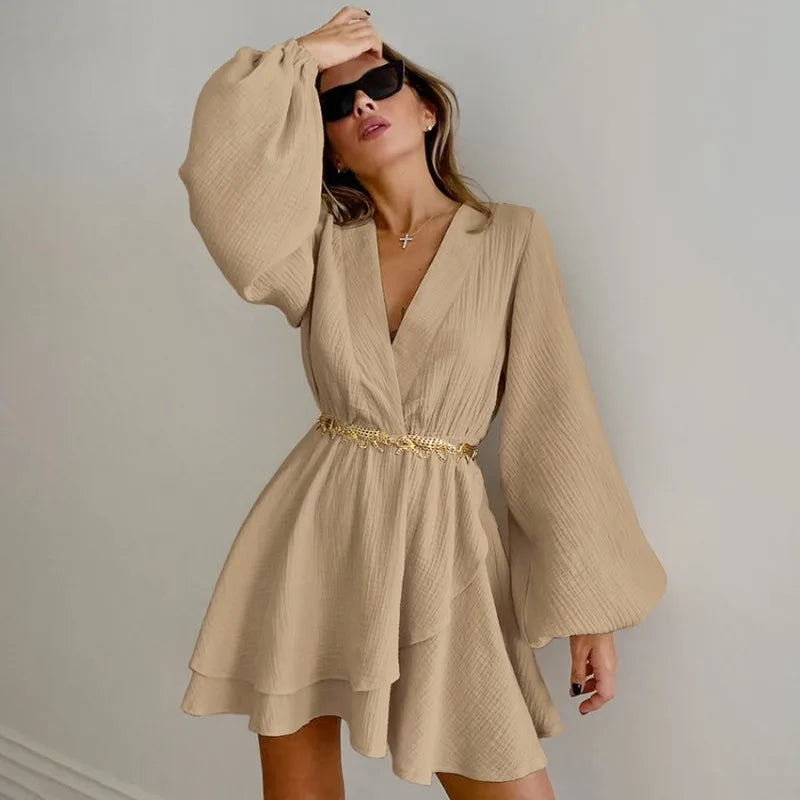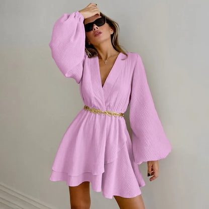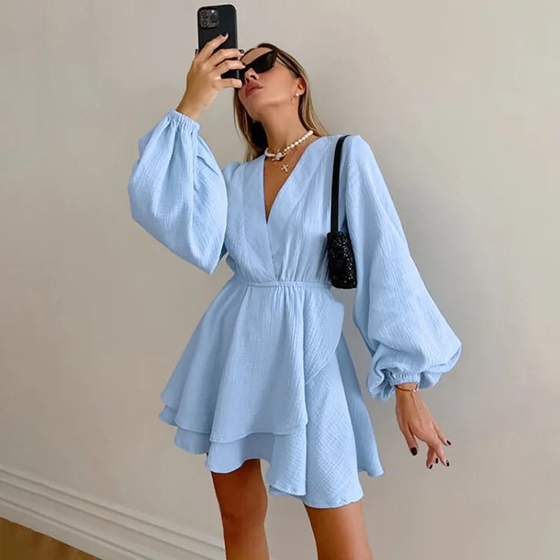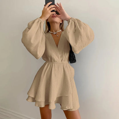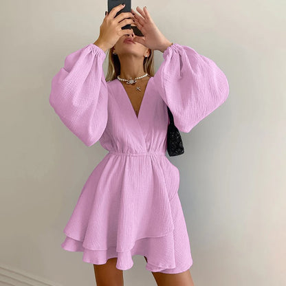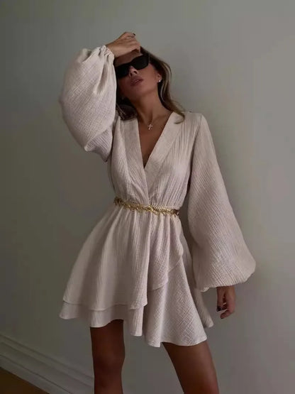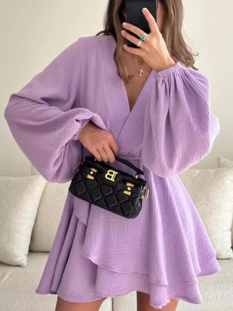 This dress boasts of exquisite pleats and dramatic lantern sleeves, all in a loose and comfortable fit. Crafted from a luxurious cotton blend, this ankle-length piece exudes sophistication and elegance. The v-neckline and tiered decoration add tasteful accents to this casual yet refined garment. Its half-length sleeves and natural fiber material composition guarantee both style and comfort. The straps and loose waist complete the look with effortless charm.