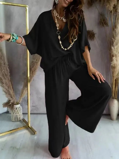 This two piece set exudes luxury and sophistication, featuring a batwing sleeve and an ankle-length pant, both made from high-quality cotton. With no decoration and medium stretch, the solid-colored shirt and wide leg pants exude elegance and style. The v-neck collar and mid-waisted design add to the tasteful and exclusive feel of this set, offering a loose yet refined fit. The elastic waist closure adds comfort and functionality.